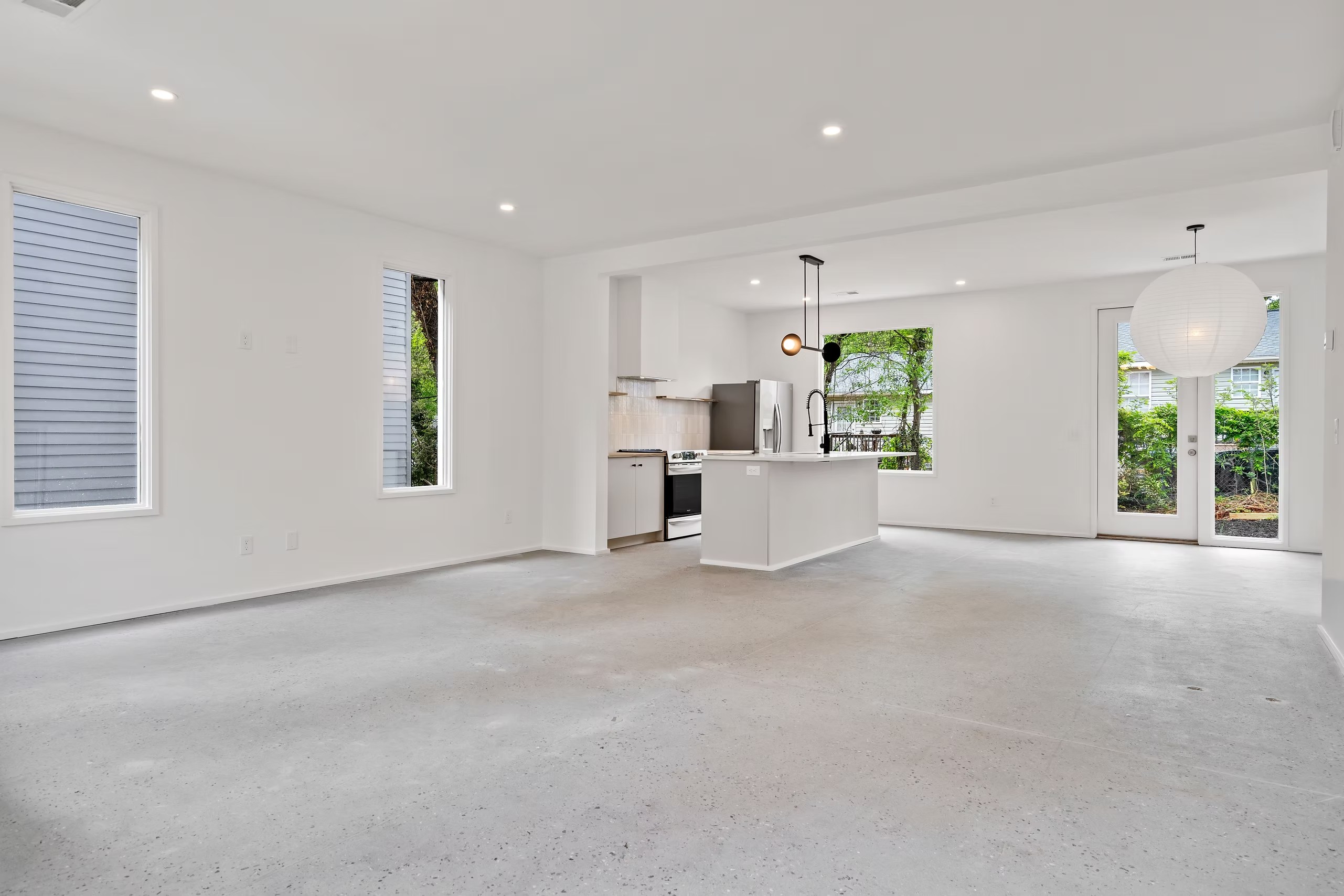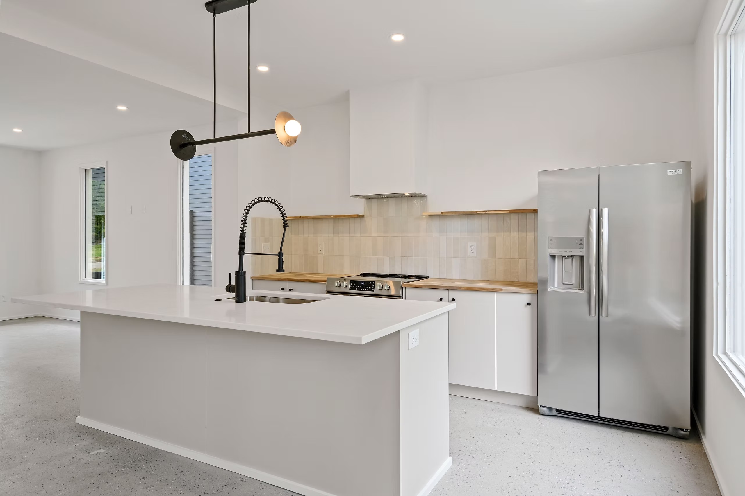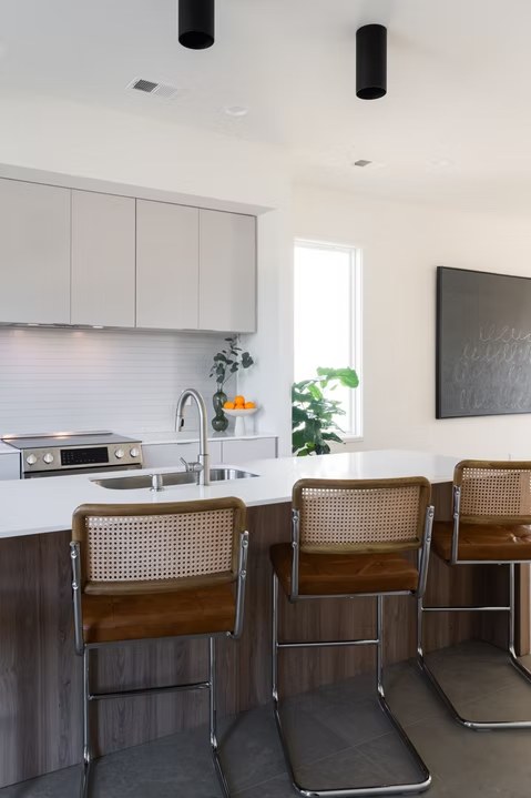 The homes use durable, cost-effective materials common to the area, elevated through thoughtful detailing and contemporary interior finishes, including open kitchens, tile flooring throughout the main level, and subtle architectural curves that soften the overall feel.