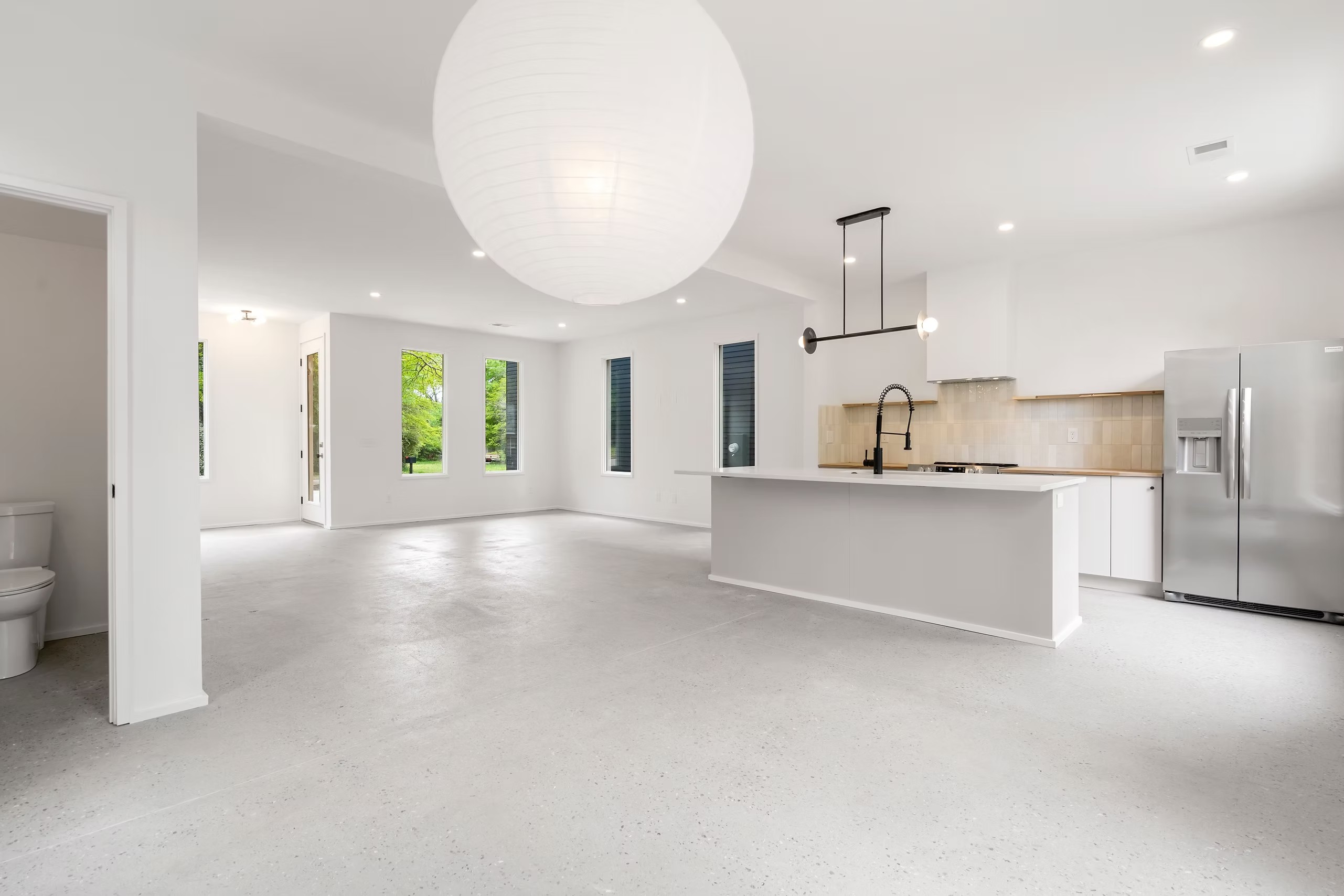 The home features a beautiful open floor plan perfect for entertaining, complete with quartz countertops, black stainless appliances, and thoughtfully sourced high-end fixtures and hardware. An extra-long driveway accommodates multiple cars.