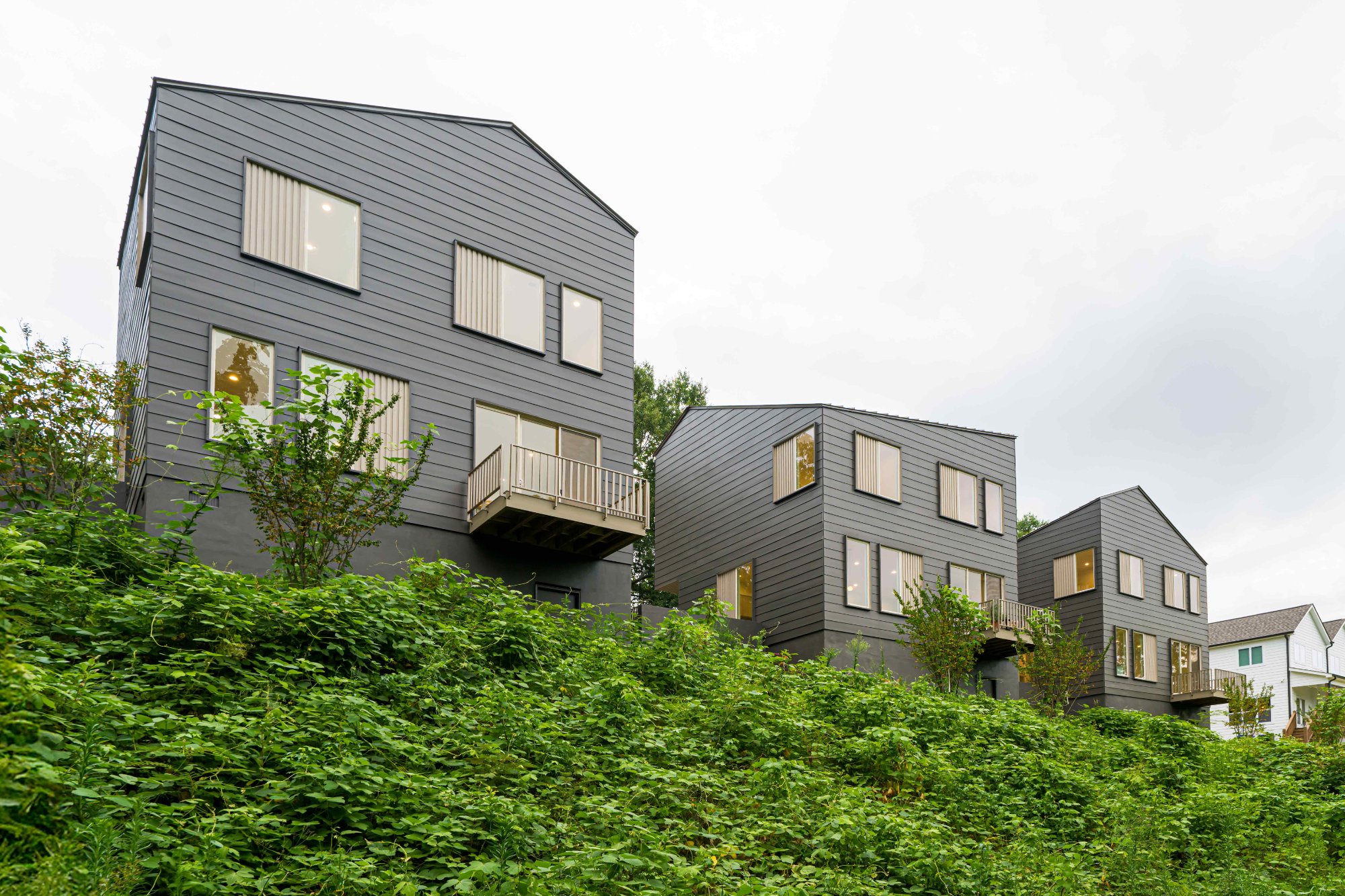 The four homes are approximately 1,750 square feet with 3 bedrooms and 2.5 bathrooms. Each residence shares the same core layout to streamline construction, with varied roof orientations that create four distinct facades. Large rear balconies extend toward the creek, taking advantage of the site's natural setting while adding outdoor living space.