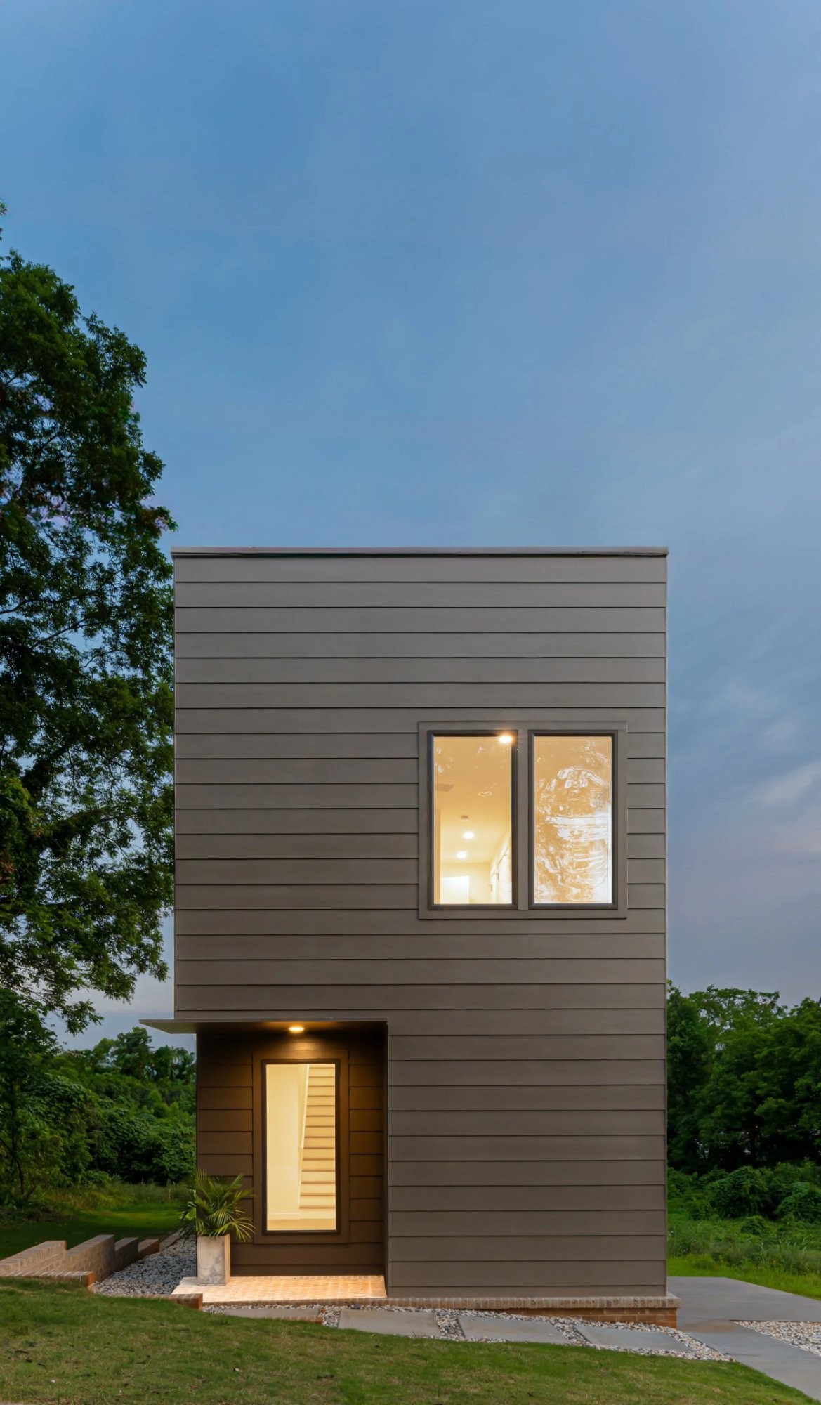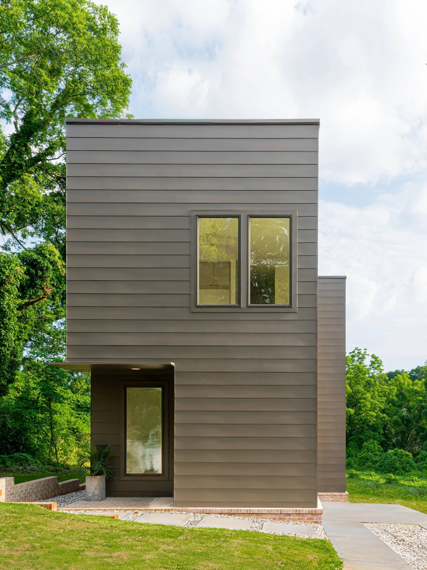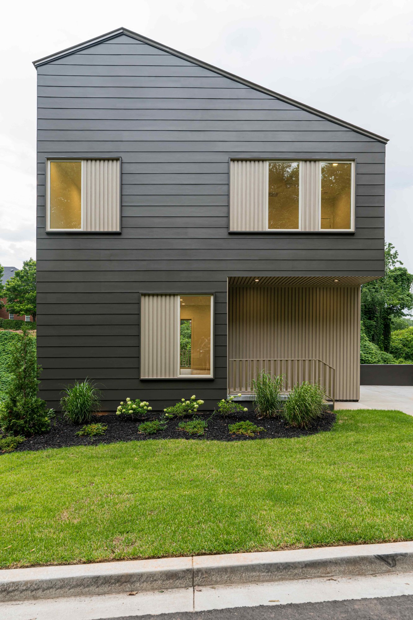 The home is approximately 3 bedrooms and 2.5 bathrooms and is organized as two connected volumes that step with the slope of the lot. Elevated ceiling heights, a central stair separating living and dining spaces, and front and rear porches create a sense of openness while maintaining an efficient footprint. Brick detailing at the base of the home ties together the foundation, porches, and exterior elements.